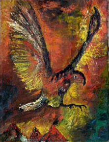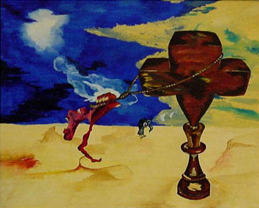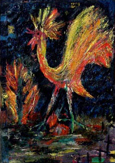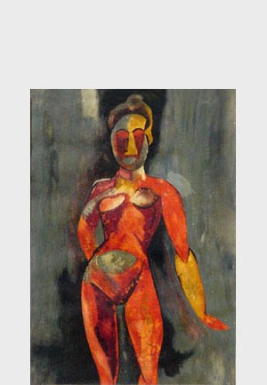 Jaren is het daarbij gebleven. Ik zal een jaar of 16 geweest zijn toen enige door de school georganiseerde museumbezoeken - onder leiding van de kunstschilders Klaas Ooievaar en Anton Mauve - mij opnieuw aanzetten om met opgerolde hemdsmouwen de wereld versteld te doen staan. Met een overgeschoten waterverfdoosje ontstonden vier gouaches: een naakt, vrij naar picasso, een exotische kop, een surrealistisch tafereel en een voorstelling die in het duits zo treffend kan worden aangeduid als Weltschmertz (de vrouw en de kansel zijn naar Frans Masereel). |